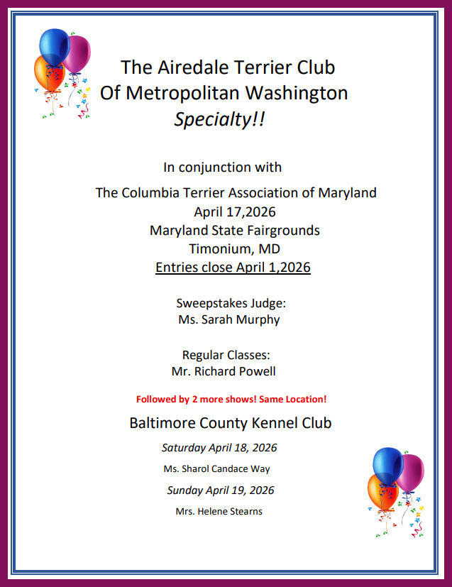 The annual ATCMW Specialty is being held in conjunction with the Columbia Terrier Association at Maryland State Fairgrounds in Timonium, MD. The exact time when Airedales will be shown will be determined once registration closes. We will forward the time to you once it becomes available.